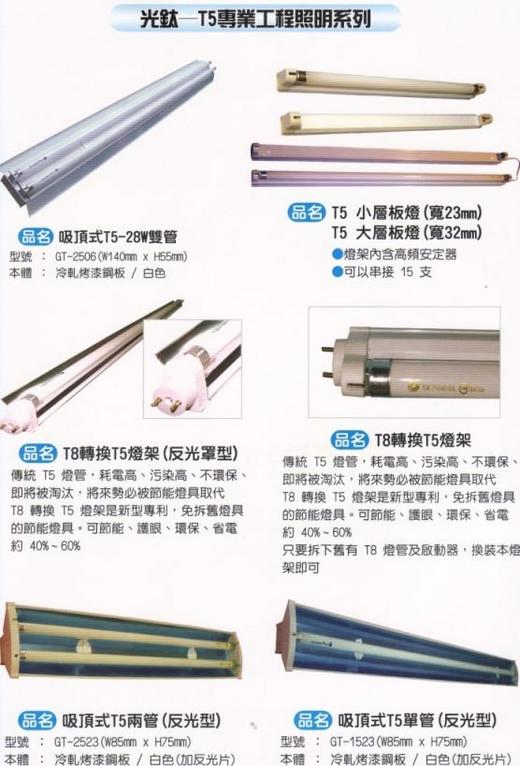 光鈦公司最新專利產品T5超省電高亮度格柵燈組(內含2支T5燈管共31w加反光片) 增加亮度 降低用電W數 ,比傳統燈具(T9,T6)96w數, T5(4支燈管62W數)更能省電費,具超廣角及高亮度,光照分佈均勻,其特色為:
